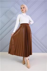 Şule Giyim Deri Görünümlü Piliseli Etek Kahverengi