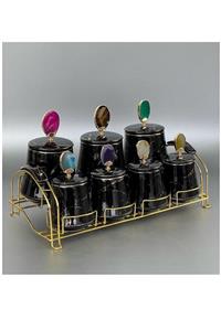 AROW Lüx Porselen 7 Li Standlı Doğaltaş Kulplu Baharat Takımı Siyah
