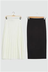 Essah Moda Kadın Siyah Kalem - Beyaz Piliseli Uzun Etek