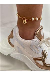 Mathilda Aksesuar Incili Kilit Detaylı Premium Gold Halhal