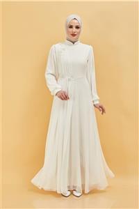 Moda Echer Kadın Ekru Tesettür Abiye Şifon İnci Görselli Tül Detaylı Elbise 7601