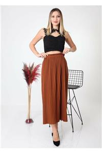 TAYHAN Kadın Taba Beli Lastikli Astarsız Pileli Pliseli Etek