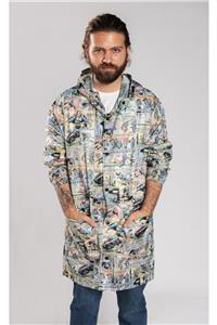 Ugiyo Erkek Beyaz Kapüşonlu Desenli Çıtçıtlı Cepli Su Geçirmez Yağmurluk