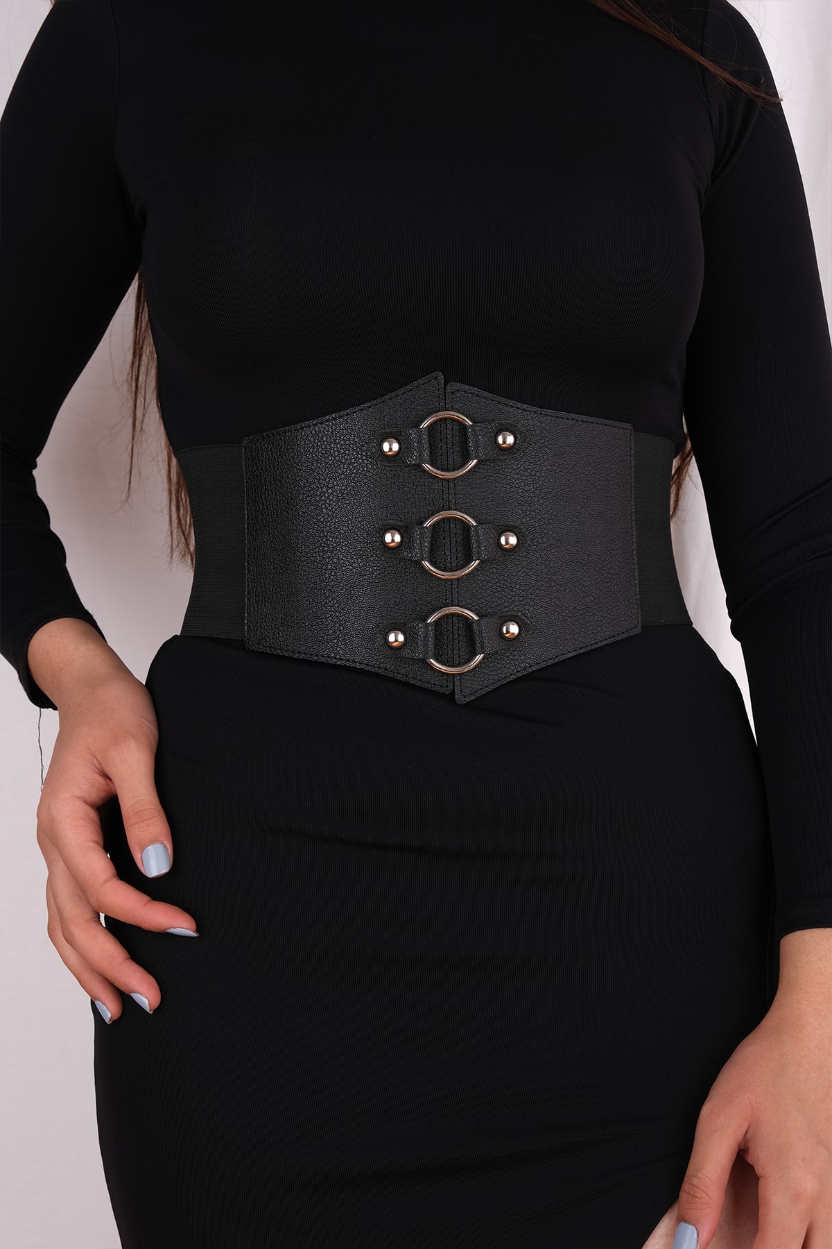Zumraonline Kadın Gümüş Aksesuarlı Siyah Suni Deri Lastikli Korse