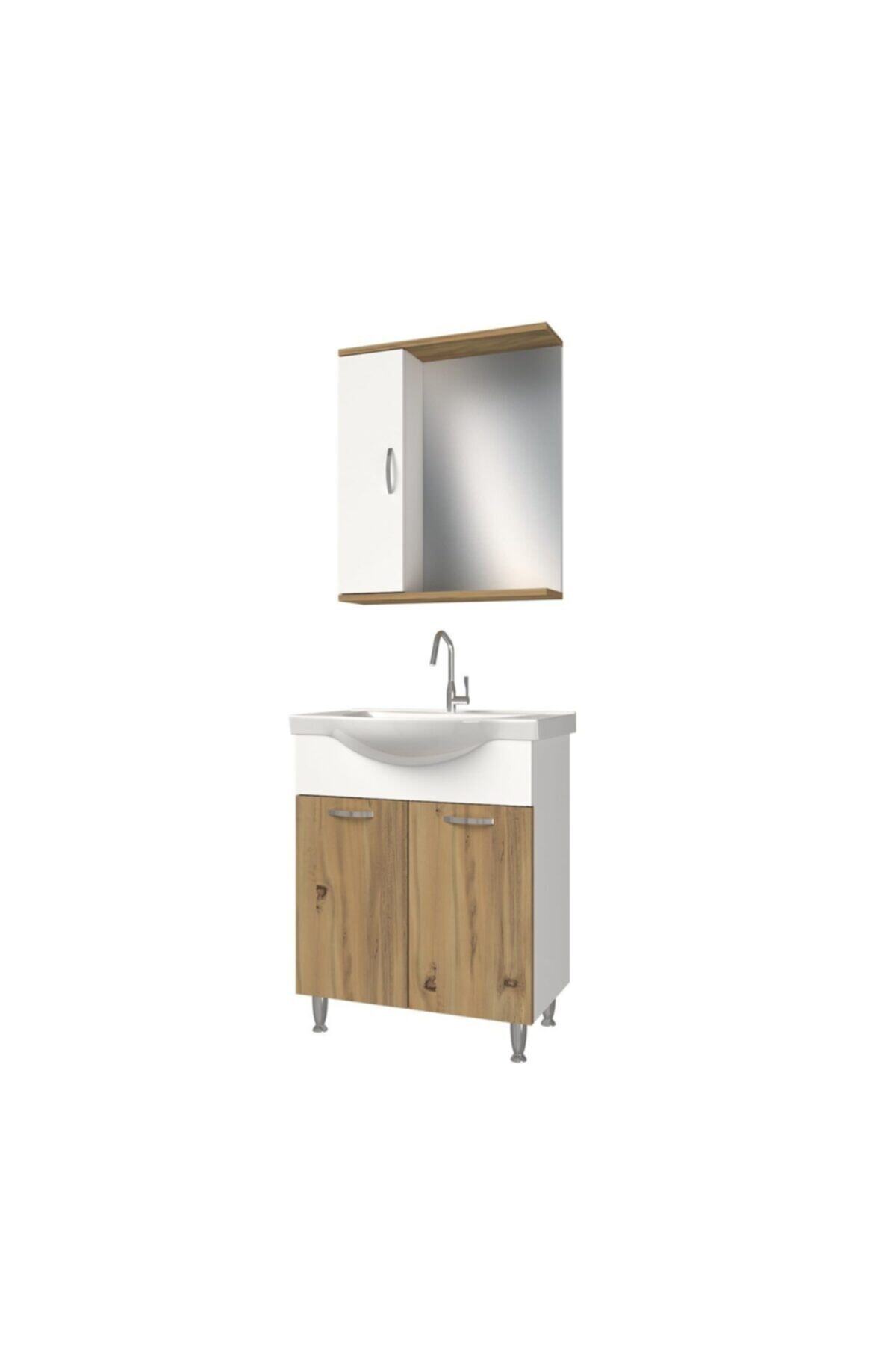 banos Kl1 Metal Ayaklı 2 Kapaklı Lavabolu Ceviz Beyaz Mdf 65 Cm Banyo Dolabı Aynalı Üst Dolabı