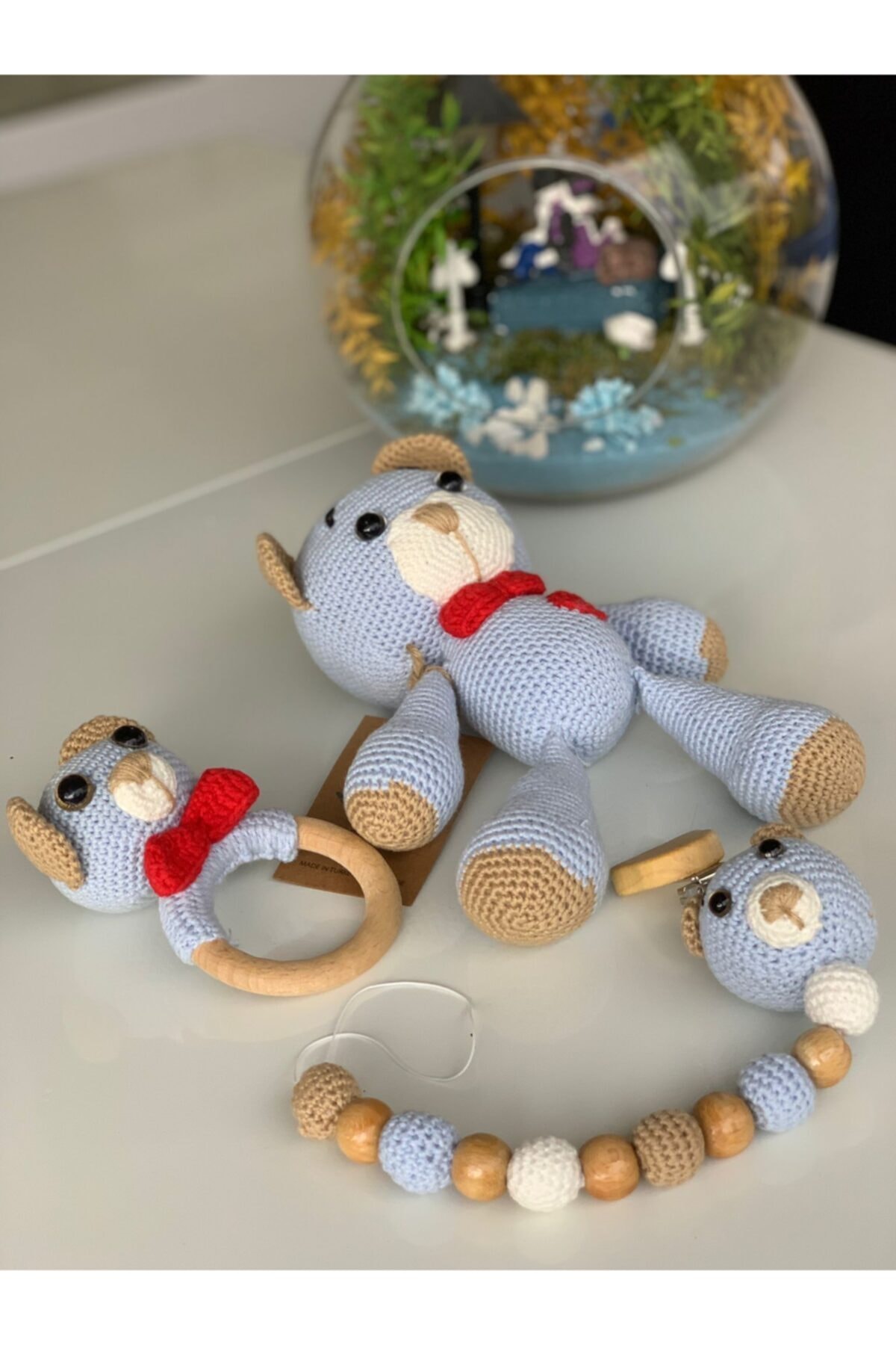 madiboooyuncak Doğal El Örgüsü Mavi Ayıcık 3 Lü Set Amigurumi Uyku Arkadaşı Diş Kaşıyıcı Ve Emzik Tutucu (25cm)